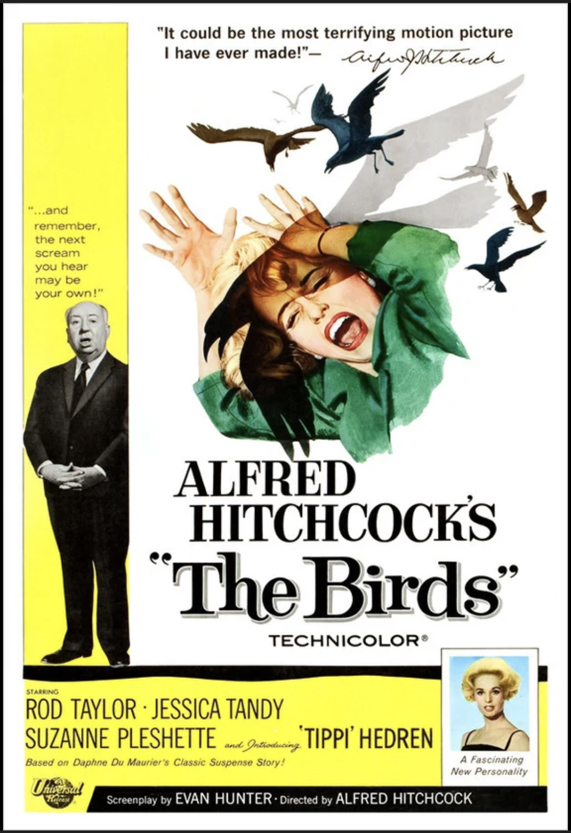 The Birds is a natural horror film produced and directed by Alfred Hitchcock, and starring Rod Taylor, Jessica Tandy, Suzanne Pleshette, and introducing Tippi Hedren in her film debut. It was apparently loosely based on a short story of the same name by Daphne du Maurier. The movie focuses on a series of sudden and unexplained violent bird attacks on the people of Bodega Bay, California, over the course of a few days.